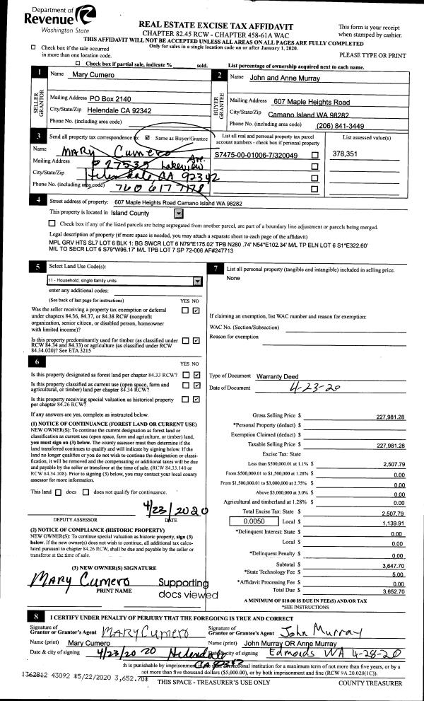 | Mailing Address: | ANNE MURRAY 607 MAPLE HEIGHTS RD CAMANO ISLAND, WA 98282 | % Ownership: | 100.0000000000% |