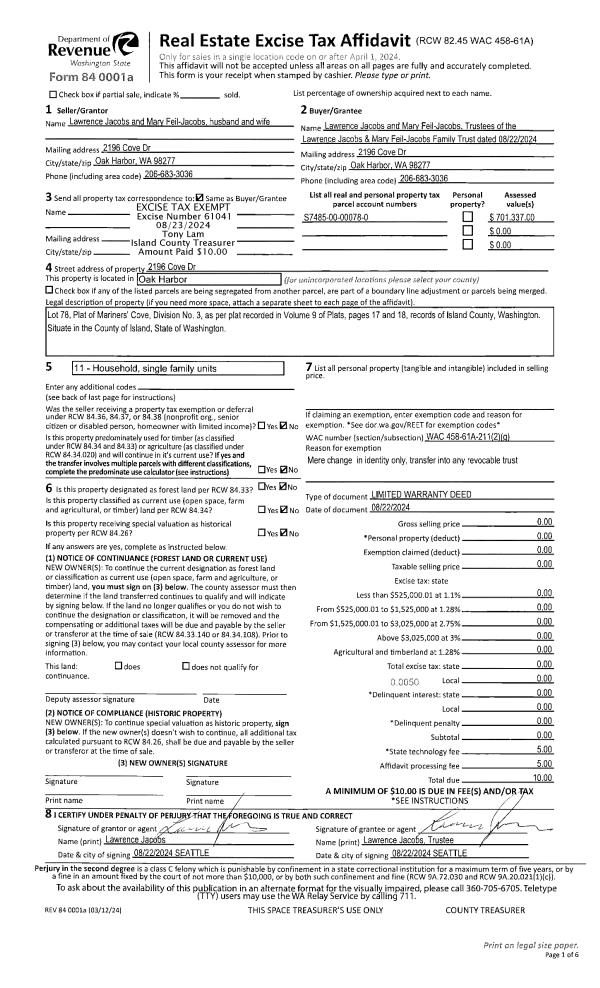 | Mailing Address: | MARY FEIL-JACOBS 2196 COVE DR OAK HARBOR, WA 98277 | % Ownership: | 100.0000000000% |