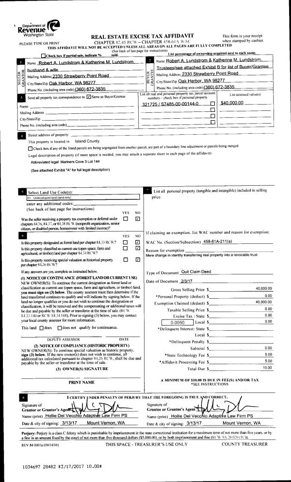 | 1 | 02/03/2017 | QCD | Quit Claim Deed | LUNDSTROM, ROBERT A | LUNDSTROM TRUSTEE, ROBERT A | | | $0.00 | 28482 | 4418977 |