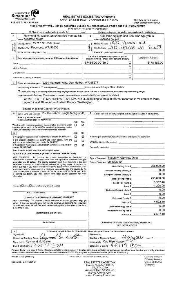 | 1 | 09/19/2019 | WD | Warranty Deed | WALTER, RAYMOND M | NGUYEN, CAO HIEN | | | $258,000.00 | 40475 | 4472328 |