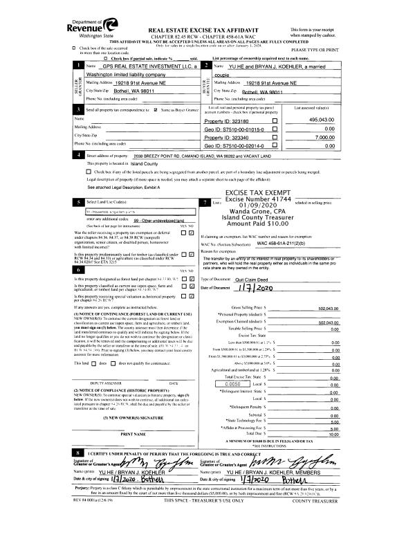 | 2 | 01/07/2020 | QCD | Quit Claim Deed | GPS REAL ESTATE INVESTMENT, LLC | HE, YU | | | $0.00 | 41744 | 4478941 |