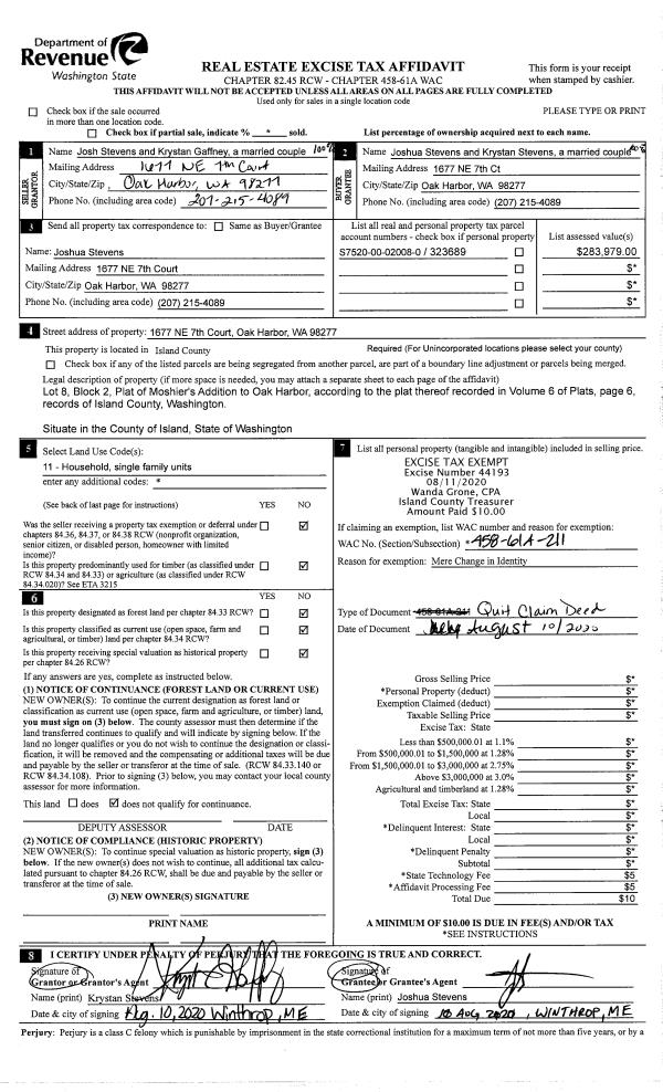 | Mailing Address: | KRYSTAN STEVENS 1677 NE 7TH CT OAK HARBOR, WA 98277-4347 | % Ownership: | 100.0000000000% |