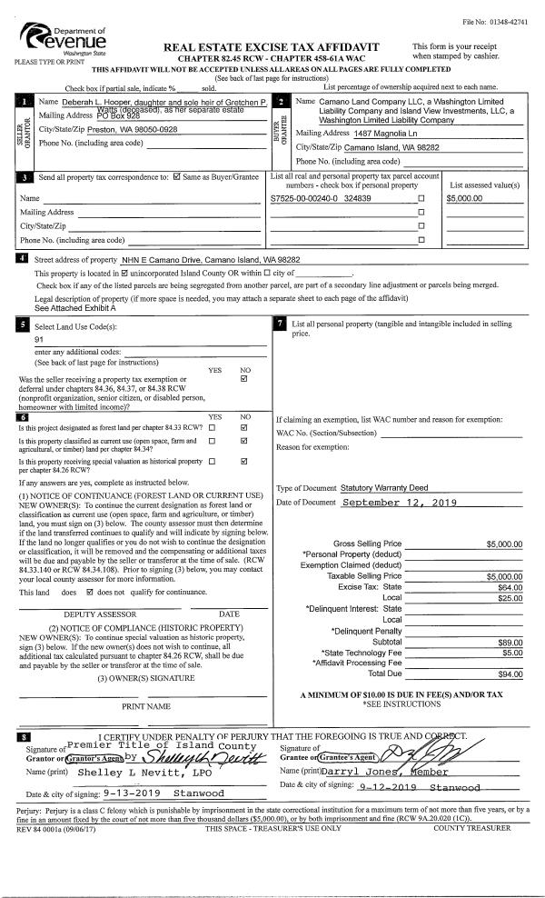 | 1 | 09/12/2019 | WD | Warranty Deed | HOOPER, DEBERAH L | CAMANO LAND COMPANY, LLC | | | $5,000.00 | 40248 | 4471311 |