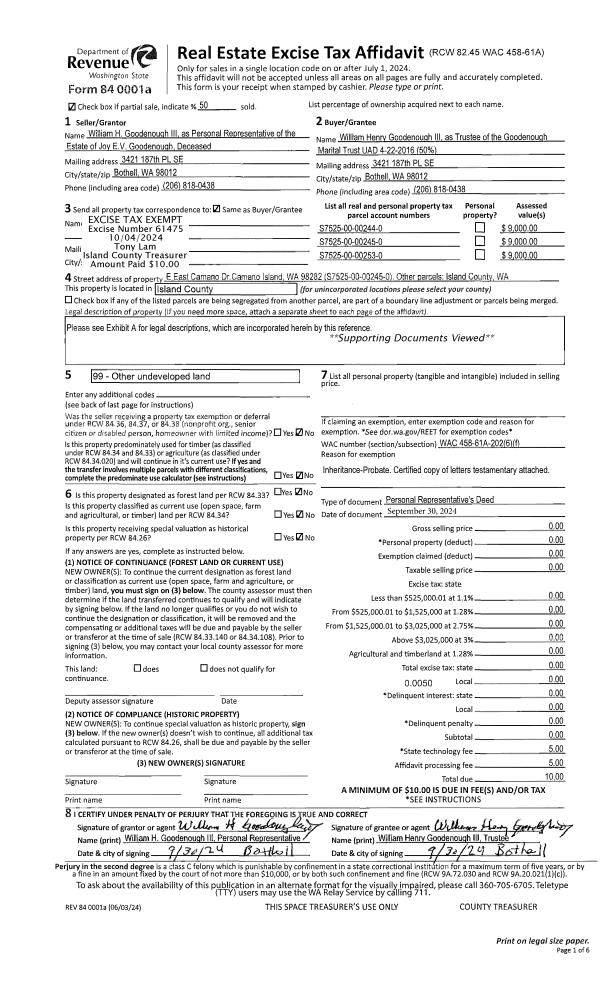 | 1 | 09/30/2024 | PRD | Personal Representatives Deed | ESTATE OF JOY E.V. GOODENOUGH | GOODENOUGH III TTEE, WILLIAM HENRY | | | $0.00 | 61475 | 4577867 |