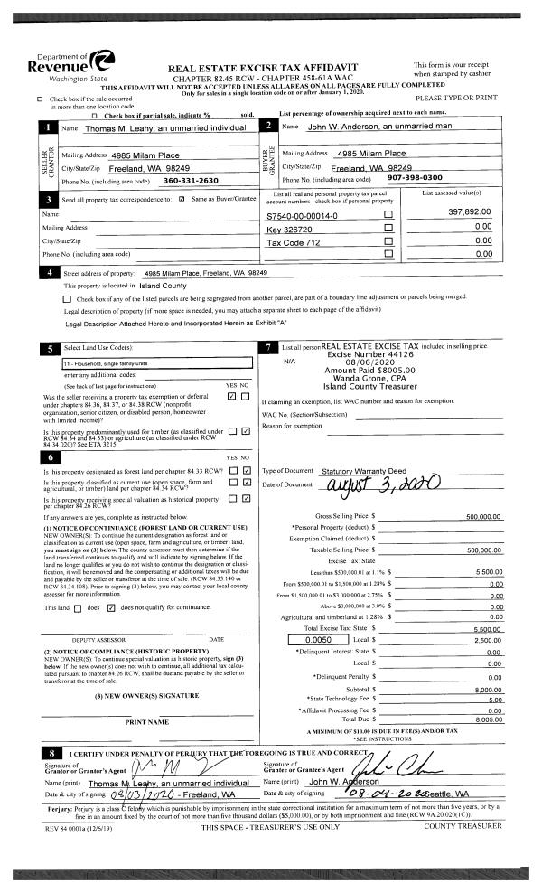 | 1 | 08/03/2020 | WD | Warranty Deed | LEAHY, THOMAS M | ANDERSON, JOHN W | | | $500,000.00 | 44126 | 4493175 |