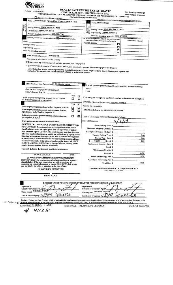 | 1 | 11/08/2019 | PRD | Personal Representatives Deed | TRUEX, PETER B | TRUEX, THERESA | | | $0.00 | 41128 | 4475710 |