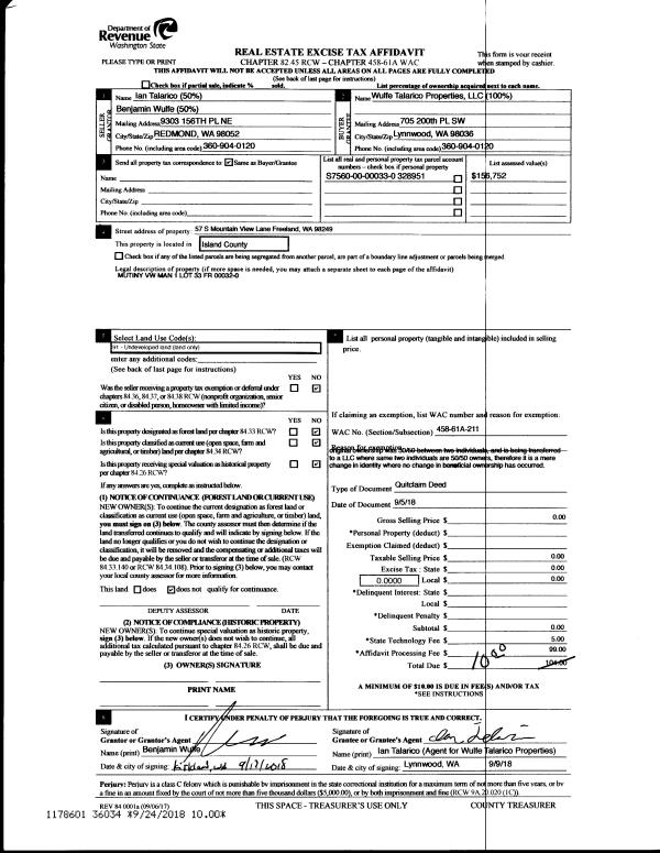 | 1 | 09/05/2018 | QCD | Quit Claim Deed | WULFE, BENJAMIN | WULFE TALARICO PROPERTIES LLC | | | $0.00 | 36034 | 4452299 |