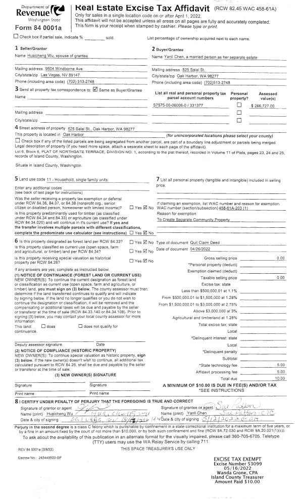 | 2 | 04/26/2022 | QCD | Quit Claim Deed | WU, HUAICHENG | CHEN, YANLI | | | $0.00 | 53099 | 4545112 |
