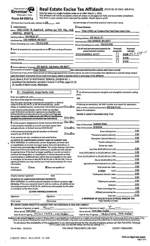 | 1 | 04/18/2024 | QCD | Quit Claim Deed | CHEN, YANLI | CHEN TTEE, YANLI | | | $0.00 | 59811 | 4571863 |