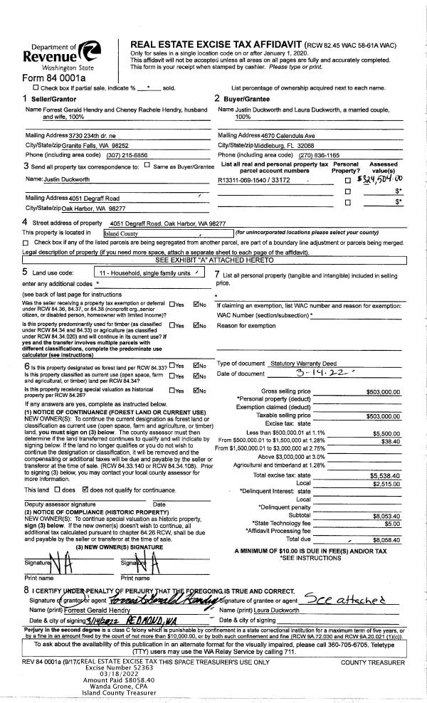 | 2 | 03/14/2022 | WD | Warranty Deed | HENDRY, FORREST GERALD | DUCKWORTH, JUSTIN | | | $503,000.00 | 52363 | 4541808 |