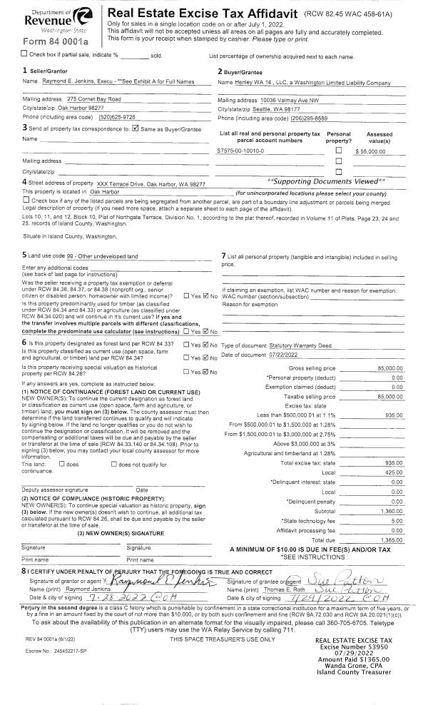 | 2 | 07/22/2022 | WD | Warranty Deed | JENKINS, OSCAR H | HENLEY WA 14 LLC | | | $85,000.00 | 53950 | 4548877 |