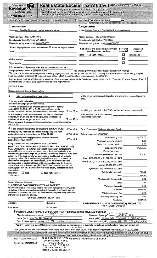 | 2 | 01/20/2021 | WD | Warranty Deed | FITZPATRICK, AMY FRANKLIN | DAHL, MICHAEL | | | $64,500.00 | 46662 | 4508820 |