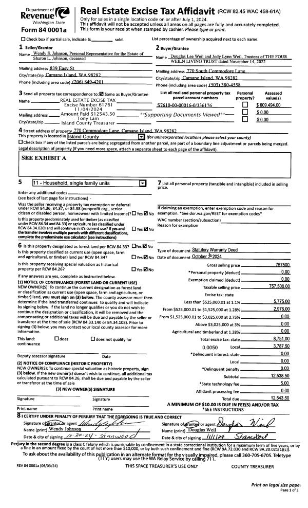 | 1 | 10/30/2024 | WD | Warranty Deed | WENDY S JOHNSON PR | WEIL TTEE, DOUGLAS LEE | | | $757,500.00 | 61761 | 4579083 |