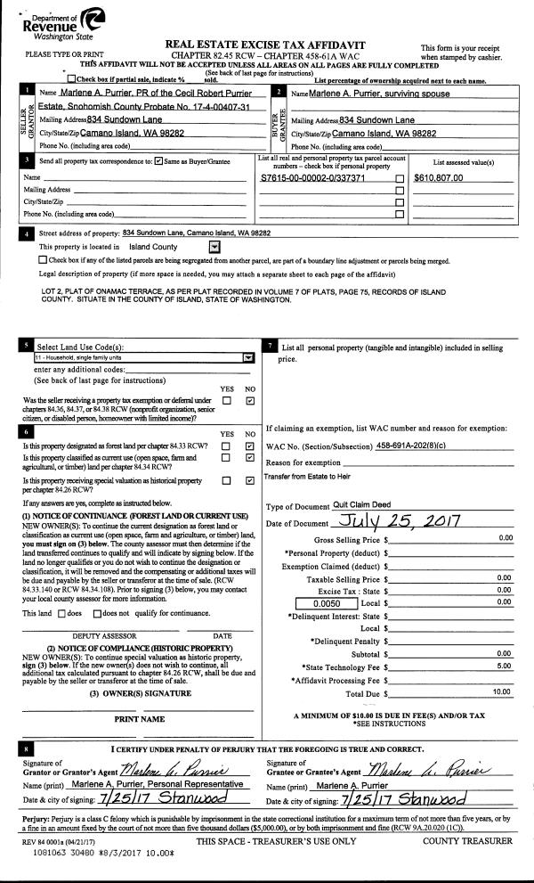 | 1 | 07/25/2017 | QCD | Quit Claim Deed | PURRIER, C ROBERT | PURRIER, MARLENE A | | | $0.00 | 30480 | 4427515 |