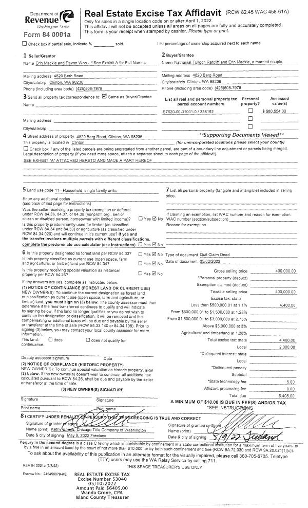 | Mailing Address: | ERIN MACKIE 4820 BERG RD CLINTON, WA 98236 | % Ownership: | 100.0000000000% |