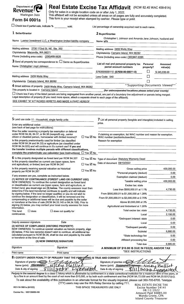 | Mailing Address: | AMANDA JANE JOHNSON 2459 WELLS WAY CAMANO ISLAND, WA 98282 | % Ownership: | 100.0000000000% |
