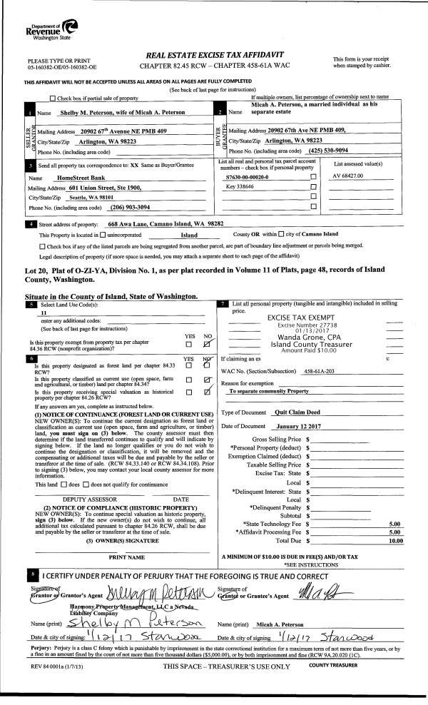 | 2 | 01/12/2017 | ESTSEPPROP | Establish Separate Property | PETERSON, MICAH A | PETERSON, MICAH A | | | $0.00 | 27738 | 4415159 |