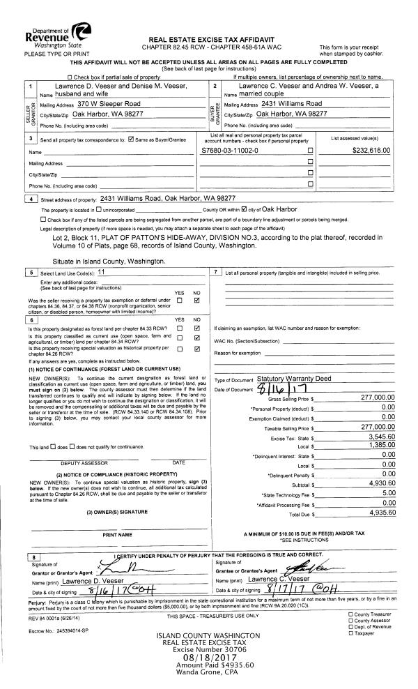 | Mailing Address: | ANDREA W VEESER 2431 WILLIAMS RD OAK HARBOR, WA 98277 | % Ownership: | 100.0000000000% |