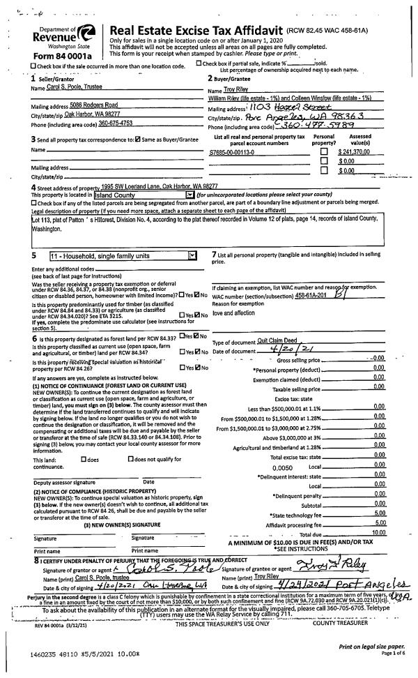 | 2 | 04/20/2021 | QCD | Quit Claim Deed | POOLE TRUSTEE, CAROL S | RILEY, TROY | | | $0.00 | 48110 | 4518407 |