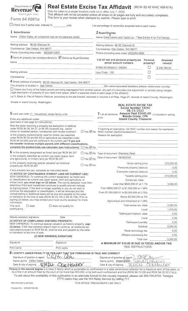 | Mailing Address: | TAYLOR LARSON HEIDI VON GREY 96 SE GLENCOE ST OAK HARBOR, WA 98277 | % Ownership: | 100.0000000000% |