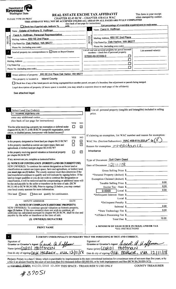 | 3 | 12/11/2018 | QCD | Quit Claim Deed | HOFFMAN, ANTHONY S / CAROL A | HOFFMAN, CAROL | | | $0.00 | 37051 | 4456903 |