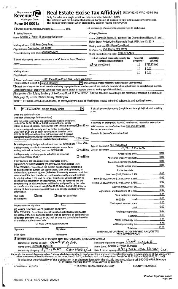 | 1 | 08/30/2023 | QCD | Quit Claim Deed | RYDER III, CHARLES D | RYDER III TTEE, CHARLES D | | | $0.00 | 57911 | 4564434 |