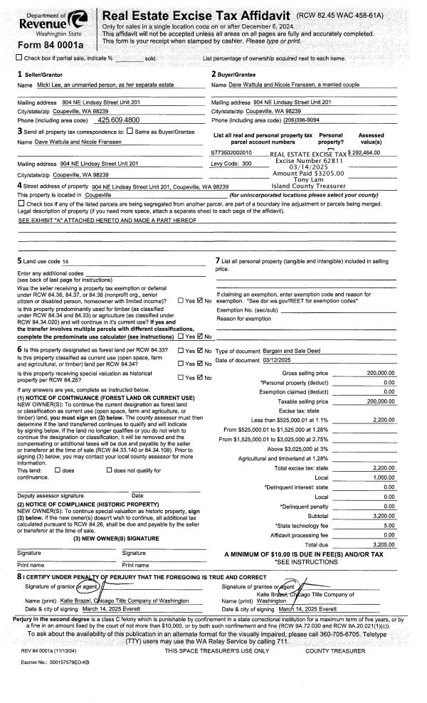 | Mailing Address: | NICOLE FRANSSEN 904 NE LINDSAY ST, UNIT 201 COUPEVILLE, WA 98239 | % Ownership: | 100.0000000000% |