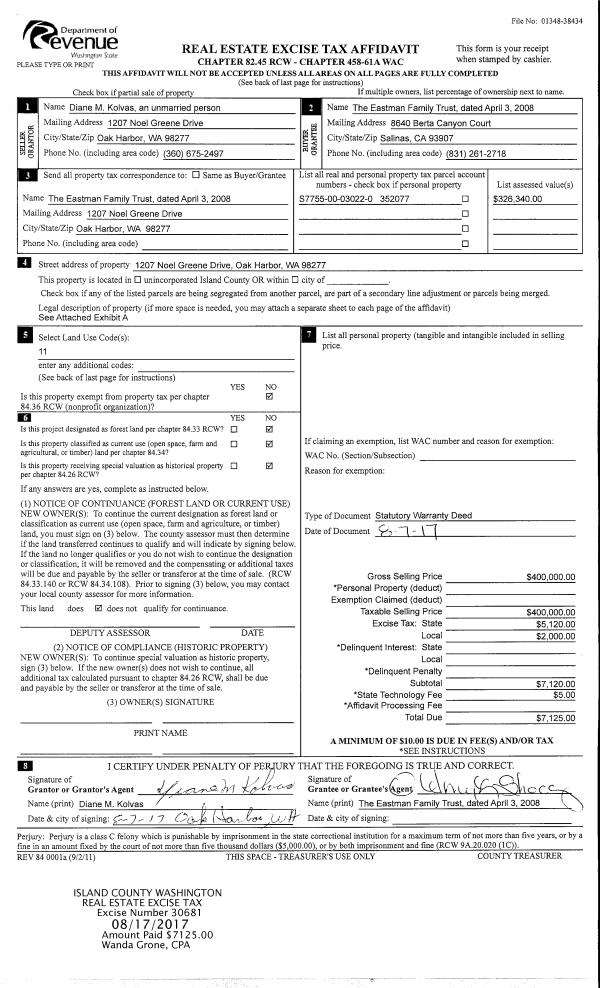 | Mailing Address: | BRIDGET M EASTMAN TRUSTEE 1207 NOEL GREENE DR OAK HARBOR, WA 98277 | % Ownership: | 100.0000000000% |