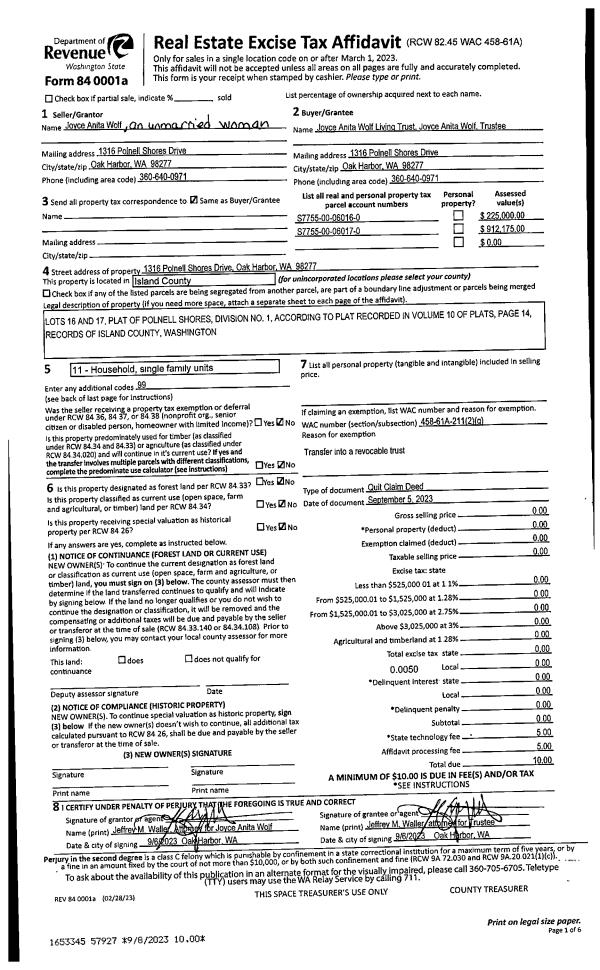 | 1 | 09/05/2023 | QCD | Quit Claim Deed | WOLF, JOYCE A | WOLF TTEE, JOYCE ANITA | | | $0.00 | 57927 | 4564490 |