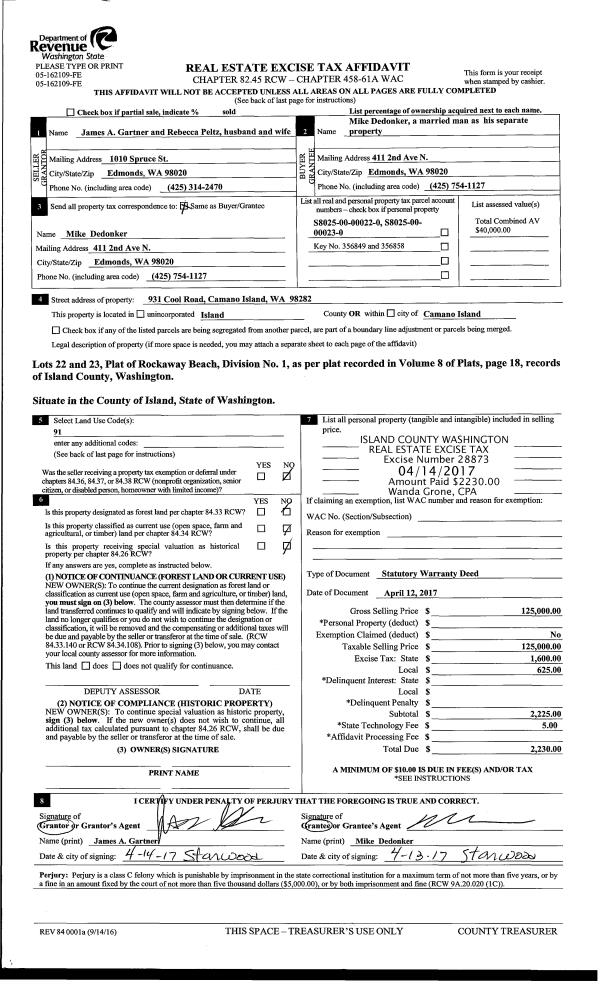 | 2 | 04/12/2017 | WD | Warranty Deed | GARTNER, JAMES A | DEDONKER, MIKE | | | $125,000.00 | 28873 | 4420724 |