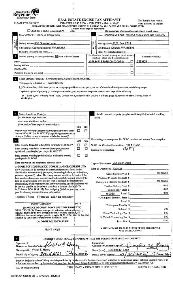 | 3 | 10/28/2021 | QCD | Quit Claim Deed | HENRY, VIC E | LENZ, DOUGLAS M | | | $0.00 | 51000 | 4534200 |