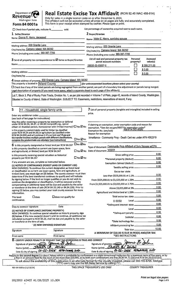 | 2 | 01/22/2021 | CPADC | Comm Prop Agmnt & Death Cert | HENRY, DONNA R | HENRY, VICTOR E | | | $0.00 | 62403 | 4581670 |