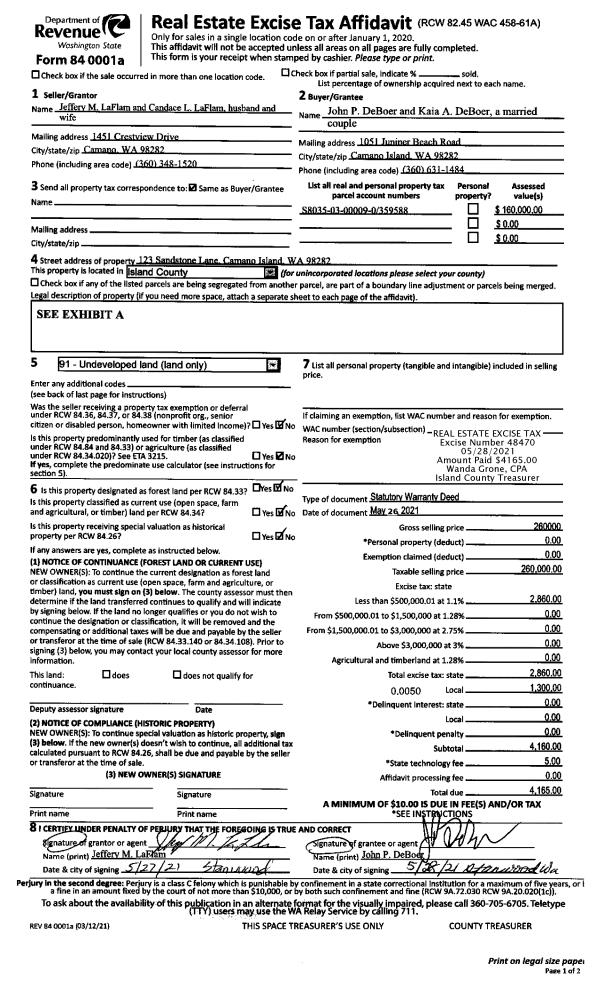 | 1 | 05/26/2021 | WD | Warranty Deed | LAFLAM, JEFFERY M | DEBOER, JOHN P | | | $260,000.00 | 48470 | 4520532 |