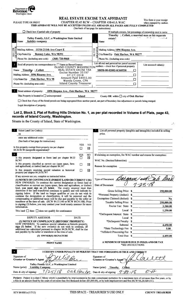 | 2 | 07/23/2018 | BARGSLD | Bargain And Sale Deed | TALLEY FAMILY, LLC | COLLETT, TIMOTHY | | | $250,000.00 | 35197 | 4448853 |