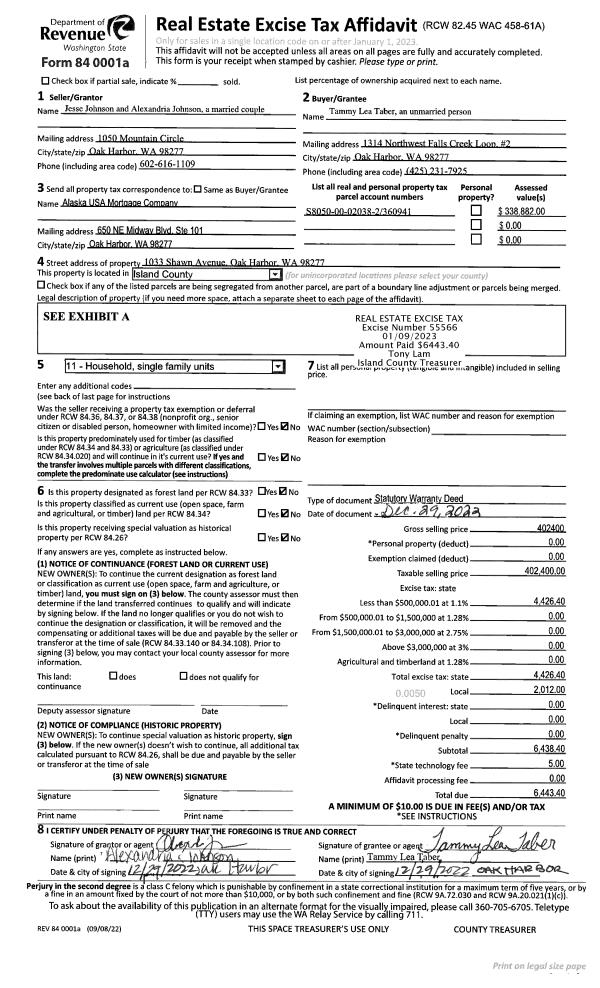 | 1 | 12/29/2022 | WD | Warranty Deed | JOHNSON, JESSE | TABER, TAMMY LEA | | | $402,400.00 | 55566 | 4555516 |