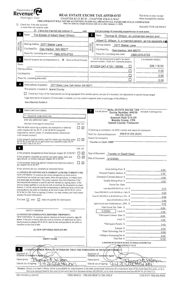 | 3 | 04/12/2020 | QCD | Quit Claim Deed | WILSON, ALBERT G | WILSON, THOMAS B | | | $0.00 | 44636 | 4396115 |