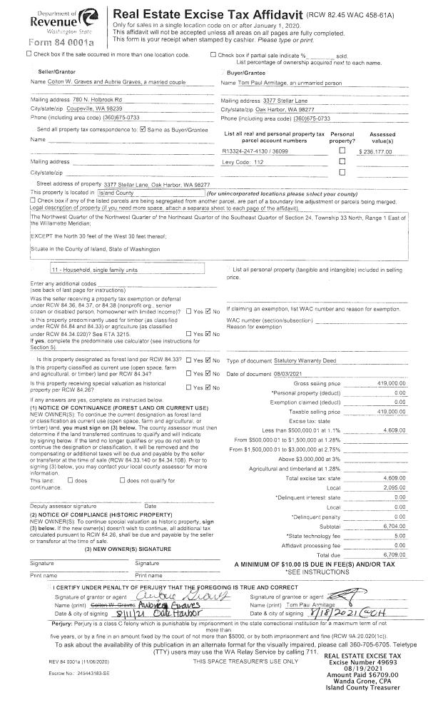 | 1 | 08/03/2021 | WD | Warranty Deed | GRAVES, COLTON W | ARMITAGE, TOM PAUL | | | $419,000.00 | 49693 | 4527221 |