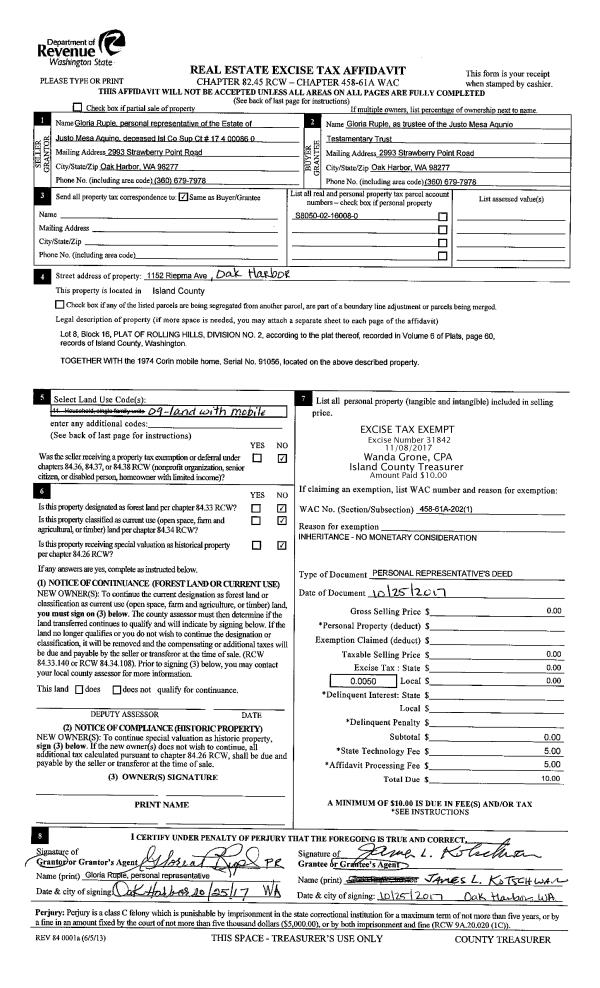 | 6 | 10/25/2017 | TRUSTEED | Trustee's Deed | AQUINO, JUSTO M | RUPLE TRUSTEE, GLORIA | | | $0.00 | 31842 | 4433756 |