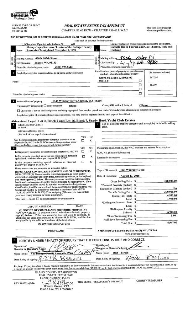 | 3 | 08/13/2018 | WD | Warranty Deed | BOLINGER, DELMAR V | THORSEN, DANIELLE RENEE | | | $390,000.00 | 35640 | 4450664 |