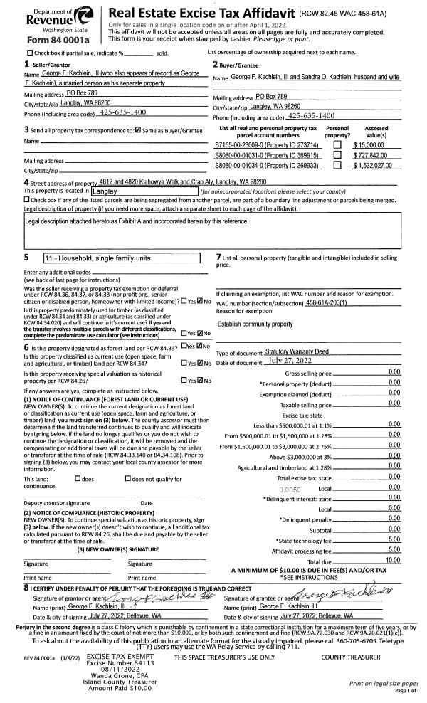| 2 | 07/27/2022 | WD | Warranty Deed | KACHLEIN III, GEORGE F | KACHLEIN III TTEE, GEORGE F | | | $0.00 | 54120 | 4549529 |