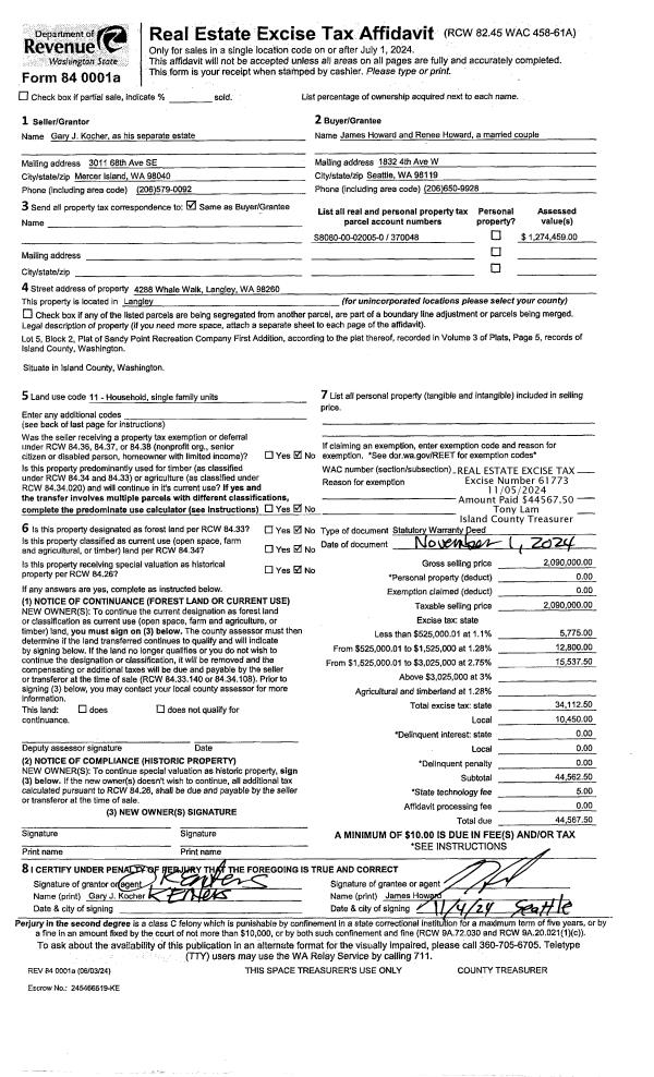 | 1 | 11/01/2024 | WD | Warranty Deed | KOCHER, GARY | HOWARD, JAMES | | | $2,090,000.00 | 61773 | 4579159 |