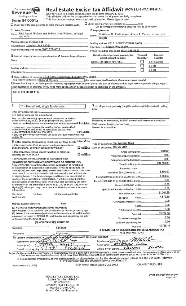 | 1 | 05/25/2021 | WD | Warranty Deed | WOLCOTT, PAUL JOSEPH | CULLEN, MATTHEW K | | | $934,500.00 | 48437 | 4520440 |