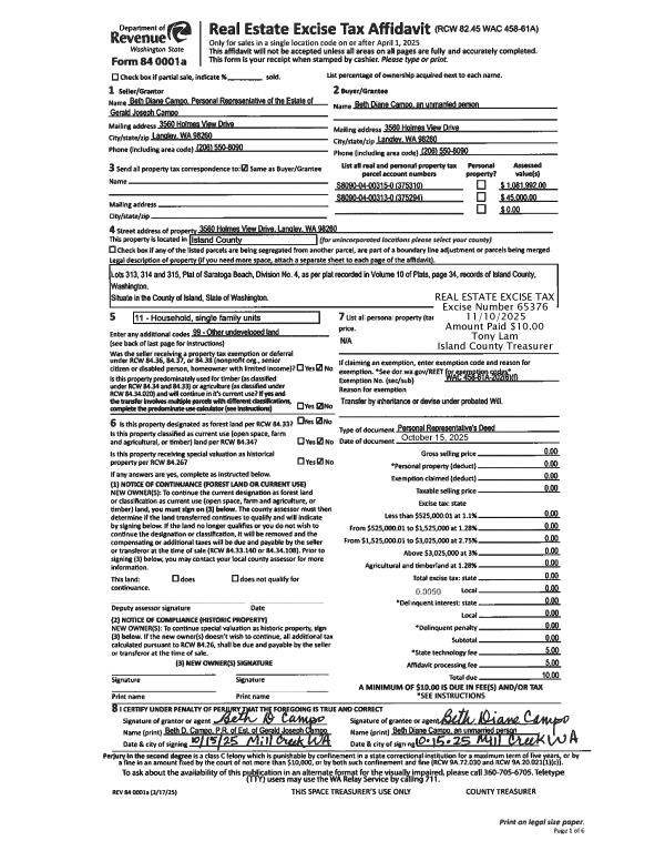| 1 | 10/15/2025 | PRD | Personal Representatives Deed | CAMPO, GERALD J | CAMPO, BETH DIANE | | | $0.00 | 65376 | 4593204 |