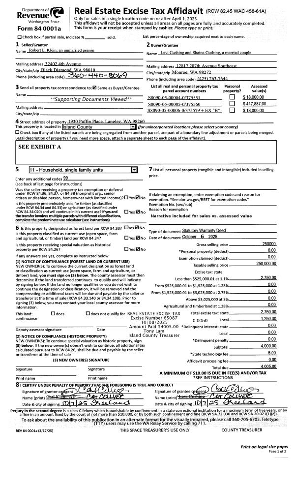 | 1 | 10/06/2025 | WD | Warranty Deed | KLEIN, ROBERT E | CUSHING, LEVI | | | $250,000.00 | 65087 | 4591950 |