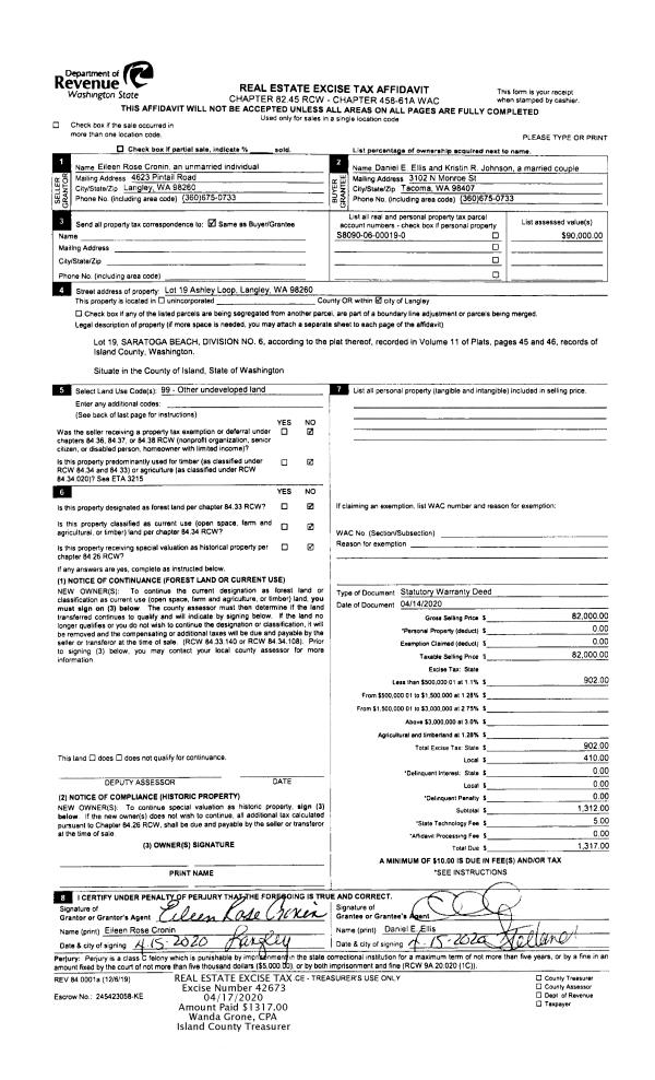 | Tax Area: | 719 - APPRAISER-S Whid Schl Dist, outside Langley, vacant & 50 acres or less | Land Use Code | 99 |