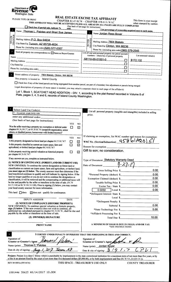 | 1 | 07/27/2017 | WD | Warranty Deed | PALOTAS, THOMAS L | BOYER, JORDAN REES | | | $0.00 | 30623 | 4428081 |