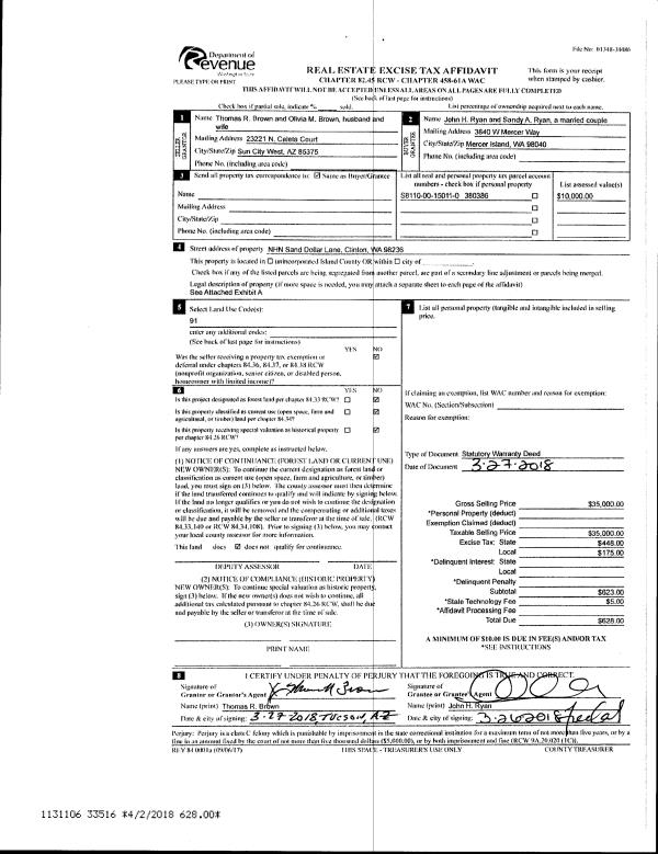 | 1 | 03/27/2018 | WD | Warranty Deed | BROWN, THOMAS R | RYAN, JOHN H | | | $35,000.00 | 33516 | 4441826 |
