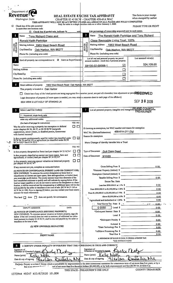 | 1 | 09/10/2020 | QCD | Quit Claim Deed | CLAPP, TONY RICHARD | PARTRIDGE TTEE, RONALD KEITH | | | $0.00 | 45147 | 4498906 |
