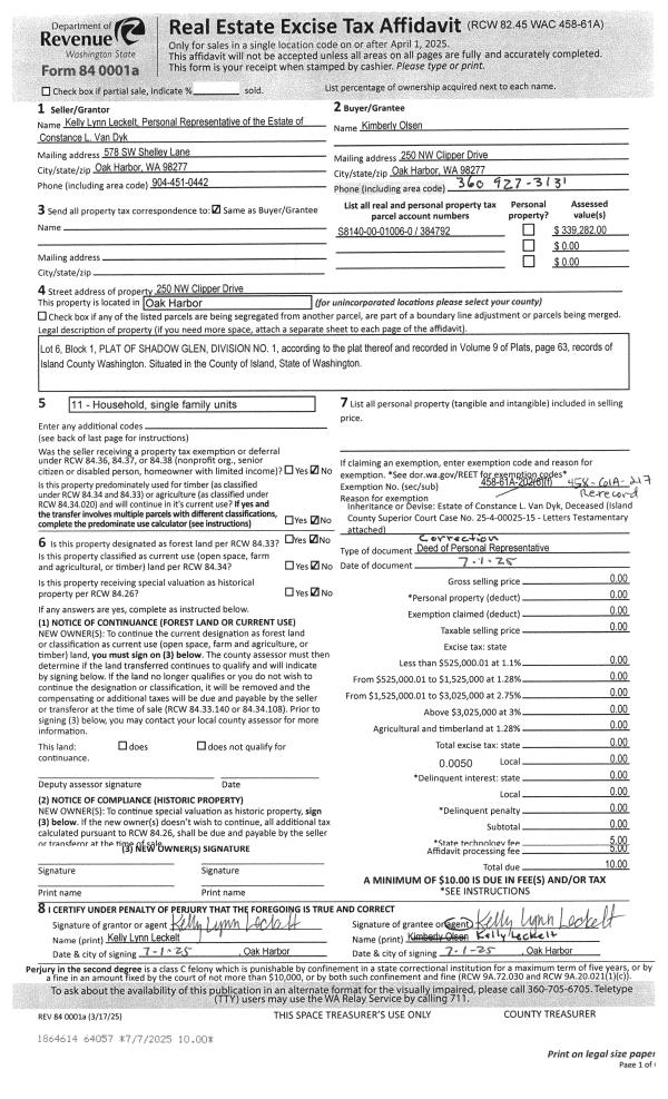 | 1 | 07/01/2025 | PRD | Personal Representatives Deed | OLSEN, KIMBERLY | OLSEN, KIMBERLY | | | $0.00 | 64057 | 4587818 |