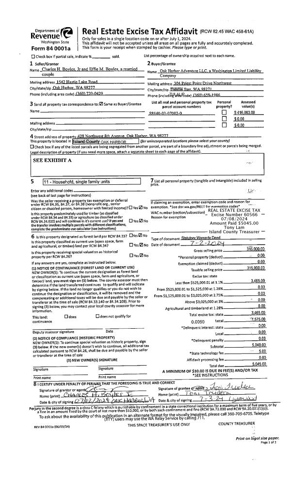 | 2 | 07/02/2024 | WD | Warranty Deed | BOYLES JR, CHARLES H | OAK HARBOR ADVENTURE LLC | | | $315,000.00 | 60566 | 4574312 |